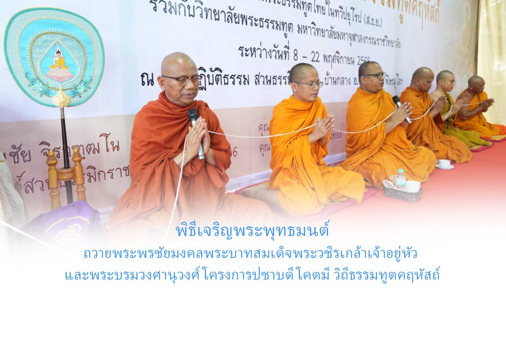 วันเสาร์ที่ ๘ พฤศจิกายน พ.ศ. ๒๕๖๘ เวลา ๑๕.๐๐ น. พระเดชพระคุณพระสิทธิวัชรบัณฑิต รองอธิการบดีฝ่ายกิจการต่างประเทศ มจร ได้มอบหมายให้พระครูสุตรัตนบัณฑิต ผู้อำนวยการวิทยาลัยพระธรรมทูต นำคณะผู้บริหาร คณาจารย์ และเจ้าหน้าที่วิทยาลัยพระธรรมทูต และกองวิเทศสัมพันธ์ ร่วมดำเนินงานโครงการปชาบดีโคตมี วิถีธรรมทูตคฤหัสถ์” โดยโครงการกำหนดให้มีพิธีเจริญพระพุทธมนต์ถวายพระพรชัยมงคลพระบาทสมเด็จพระวชิรเกล้าเจ้าอยู่หัว และพระบรมวงศานุวงศ์ ในพิธีมีพระเดชพระคุณพระราชวชิรศาสนวิเทศ ประธานสหภาพพระธรรมทูตไทยในทวีปยุโรปเป็นประธานในพิธี และคุณกนกพร นิมิตรวิลาส เป็นประธานฝ่ายคฤหัสถ์ โครงการฯ กิจกรรมดังกล่าว จัดขึ้นระหว่างวันที่ ๘ – ๒๒ พฤศจิกายน ๒๕๖๘ ณ สวนปฏิบัติธรรม สวนธรรมิกราช ตำบลบ้านกลาง อำเภอวังทอง จังหวัดพิษณุโลก ดำเนินการโดยวิทยาลัยพระธรรมทูต มหาวิทยาลัยมหาจุฬาลงกรณราชวิทยาลัย ร่วมกับสหภาพพระธรรมทูตไทยในทวีปยุโรป