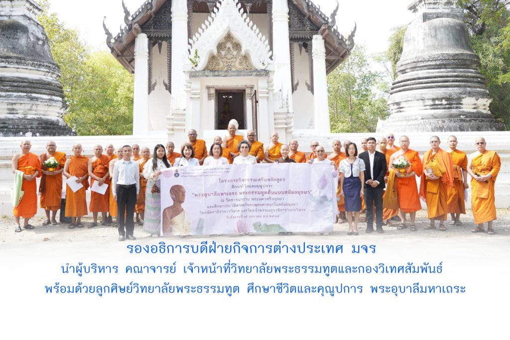 วันอังคารที่ ๑๔ มกราคม พ.ศ.๒๕๖๘ เวลา ๑๓.๓๐ น. พระมหาสุรศักดิ์ ปจฺจนฺตเสโน รองอธิการบดีฝ่ายกิจการต่างประเทศ ประธานคณะกรรมการดำเนินงานโครงการอบรมพระธรรมทูตสายต่างประเทศ และ พระมหาประยูร โชติวโร ผู้อำนวยการวิทยาลัยพระธรรมทูต นำผู้บริหาร คณาจารย์ เจ้าหน้าที่วิทยาลัยพระธรรมทูตและกองวิเทศสัมพันธ์ พร้อมด้วยลูกศิษย์วิทยาลัยพระธรรมทูตสายต่างประเทศ หลักสูตรปริญญาโท พุทธศาสตรมหาบัณฑิต สาขาวิชาพระธรรมทูต หลักสูตรประกาศนียบัตรพระธรรมทูต หลักสูตรประกาศนียบัตร วิปัสสนากรรมฐาน ศึกษาชีวิตและคุณูปการ พระอุบาลีมหาเถระ พระธรรมทูตต้นแบบ ณ วัดธรรมาราม พระนครศรีอยุธยา โอกาสนี้ รองอธิการบดีฝ่ายกิจการต่างประเทศ ได้บรรยายเรื่อง ชีวิตและคุณูปการของพระอุบาลีมหาเถระกับการเผยแผ่พระพุทธศาสนาในต่างประเทศ แก่นิสิตวิทยาลัยพระธรรมทูต จากนั้น ได้นำนิสิตวิทยาลัยพระธรรมทูต เปล่งวาจาปฏิญาณตนเบื้องหน้าพระอุบาลีมหาเถระ ในการเป็นพระธรรมทูตสายต่างประเทศเพื่อเผยแผ่พระพุทธศาสนา ยังประโยชน์สุขและความดีงามให้เกิดแก่ชาวโลกสืบไป กราบขอบพระคุณ หลวงพ่อเจ้าอาวาสวัดธรรมาราม ที่เมตตาอนุเคราะห์ให้โอกาส ผู้บริหาร คณาจารย์ เจ้าหน้าที่ และนิสิตวิทยาลัยพระธรรมทูต เข้าถวายสักการะพระอุบาลีมหาเถระ และเยี่ยมชมศึกษาประวัติศาสตร์พระพุทธศาสนาในสมัยกรุงศรีอยุธยา มา ณ โอกาสนี้ ฯ …