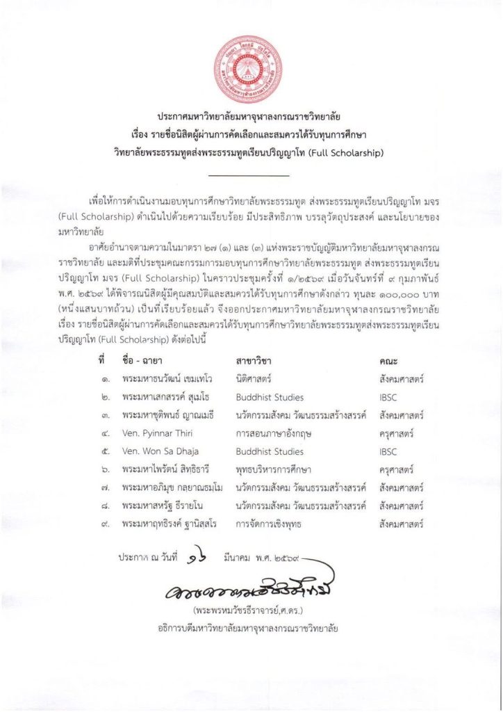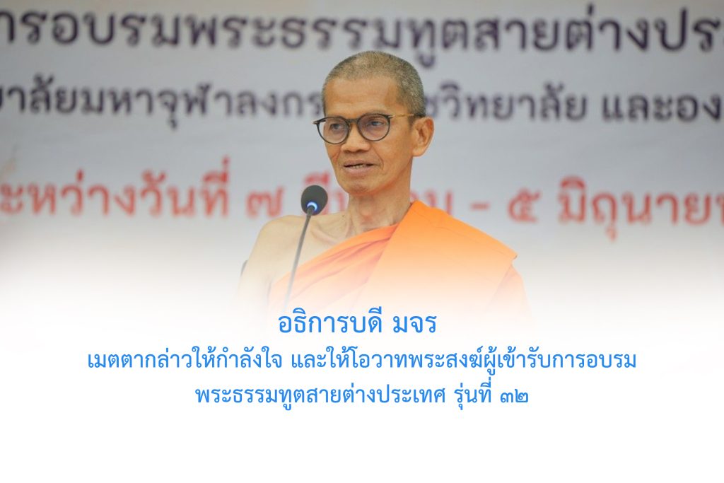 วันจันทร์ที่ ๑๖ มีนาคม พ.ศ.๒๕๖๙ เวลา ๑๓.๓๐ น. พระพรหมวัชรธีราจารย์ อธิการบดีมหาวิทยาลัยมหาจุฬาลงกรณราชวิทยาลัย รองประธานสำนักงานกำกับดูแลพระธรรมทูตสายต่างประเทศ เมตตากล่าวให้กำลังใจ แก่ คณะผู้บริหาร คณาจารย์ เจ้าหน้าที่ วิทยาลัยพระธรรมทูต กองวิเทศสัมพันธ์ และศูนย์อินเดียศึกษา และ ให้โอวาทพระสงฆ์ผู้เข้ารับการอบรมพระธรรมทูตสายต่างประเทศ รุ่นที่ ๓๒ ณ ห้องประชุมเธียเตอร์โซนบี อาคารเรียนรวม มจร พระนครศรีอยุธยา การนี้ พระครูสุตรัตนบัณฑิต ผู้อำนวยการวิทยาลัยพระธรรมทูต เลขานุการคณะกรรมการดำเนินงานโครงการอบรมพระธรรมทูตสายต่างประเทศ กล่าวถวายรายงาน จากนั้น พระเดชพระคุณองค์อธิการบดี เมตตากล่าวให้โอวาท กำลังใจและปาฐกถาพิเศษ ในนามคณะผู้บริหาร คณาจารย์ เจ้าหน้าที่ วิทยาลัยพระธรรมทูต กองวิเทศสัมพันธ์ และศูนย์อินเดียศึกษา พร้อมด้วยพระสงฆ์ผู้เข้ารับการอบรมพระธรรมทูตสายต่างประเทศ รุ่นที่ ๓๒ ขอกราบขอบพระคุณ พระเดชพระคุณองค์อธิการบดี ที่เมตตา ด้วยความเคารพ มา ณ โอกาสนี้ ฯ