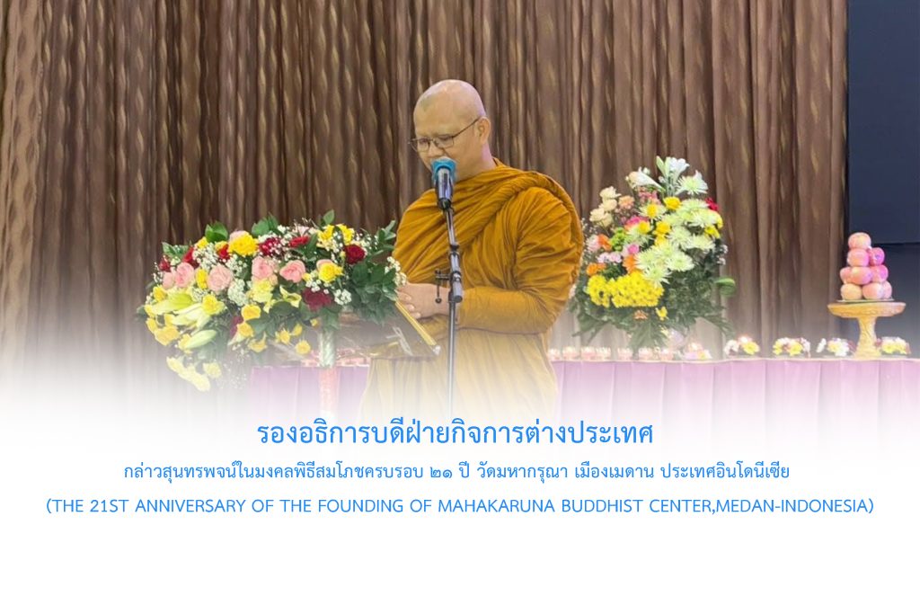 วันอาทิตย์ที่ ๒๑ ธันวาคม พ.ศ.๒๕๖๘ เวลา ๑๙.๓๐ น. พระสิทธิวัชรบัณฑิต รองอธิการบดีฝ่ายกิจการต่างประเทศ มจร ร่วมเป็นเกียรติบันทึกภาพประวัติศาสตร์ มงคลพิธีสมโภชครบรอบ ๒๑ ปี วัดมหากรุณา เมืองเมดาน ประเทศอินโดนีเซีย (The 21st Anniversary of The Founding of Mahakaruna Buddhist Center,Medan-Indonesia) โดยมีพระสงฆ์และนักวิชาการนานาชาติ ร่วมเป็นเกียรติบันทึกภาพ พระธรรมาจารย์ ฮุ้ย สง Most Venerable Dr.Hui Siong ประธานสมาคมพระพุทธศาสนาแห่งอินโดนีเซีย ประธานสภาสงฆ์โลก (The President of World Sangha Council) อาราธนา พระสิทธิวัชรบัณฑิต รองอธิการบดีฝ่ายกิจการต่างประเทศ มจร กล่าวสุนทรพจน์ภาคภาษาอังกฤษ ในมงคลพิธี The 21st Anniversary of the …