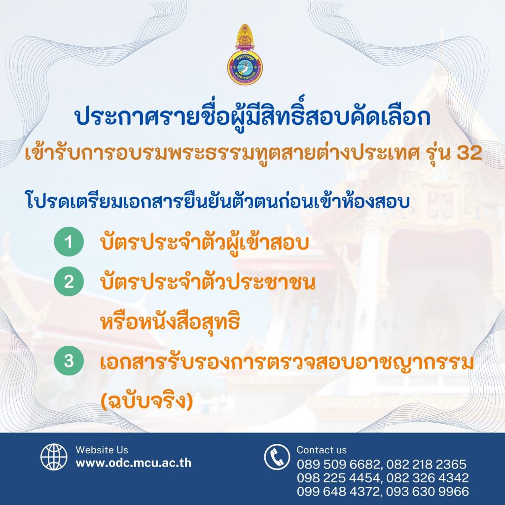 ประกาศรายชื่อผู้ผ่านการสอบคัดเลือกและมีสิทธิ์เข้ารับการอบรมในโครงการอบรมพระธรรมทูตสายต่างประเทศ รุ่นที่ 32/2569