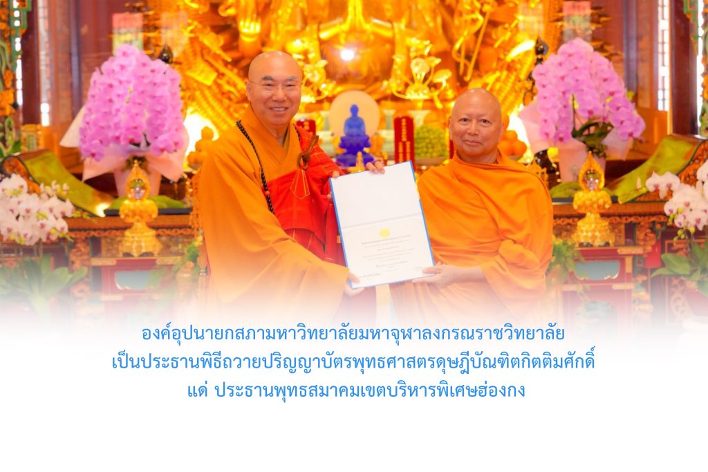วันจันทร์ที่ ๕ มกราคม พ.ศ.๒๕๖๙ เวลา ๑๕.๐๐ น. พระพรหมบัณฑิต องค์อุปนายกสภามหาวิทยาลัยมหาจุฬาลงกรณราชวิทยาลัย เป็นประธานพิธีถวายปริญญาบัตรพุทธศาสตรดุษฎีบัณฑิตกิตติมศักดิ์ แด่ Most Venerable Shi Kuan Yun, The President of Hong Kong Buddhist Association and the Chancellor of the Hong Kong Tung Lum Pure Land lnstitute ณ หอประชุมแห่ง The Hong Kong Tung Lum Pure Land lnstitute โอกาสนี้ พระพรหมวัชรธีราจารย์ อธิการบดี ได้ถวายใบประกาศเกียรติคุณ พระปัญญาวัชรบัณฑิต รองอธิการบดีฝ่ายวิชาการ ถวายเครื่องประกอบปริญญา พระศรีวัชรศาสตรบัณฑิต รองอธิการบดีฝ่ายประชาสัมพันธ์และเผยแผ่ ถวายผ้าไตรจีวร …