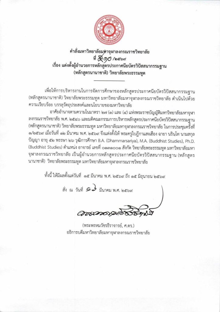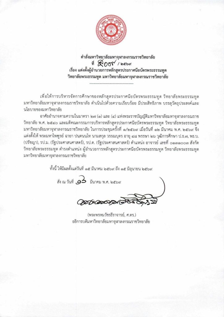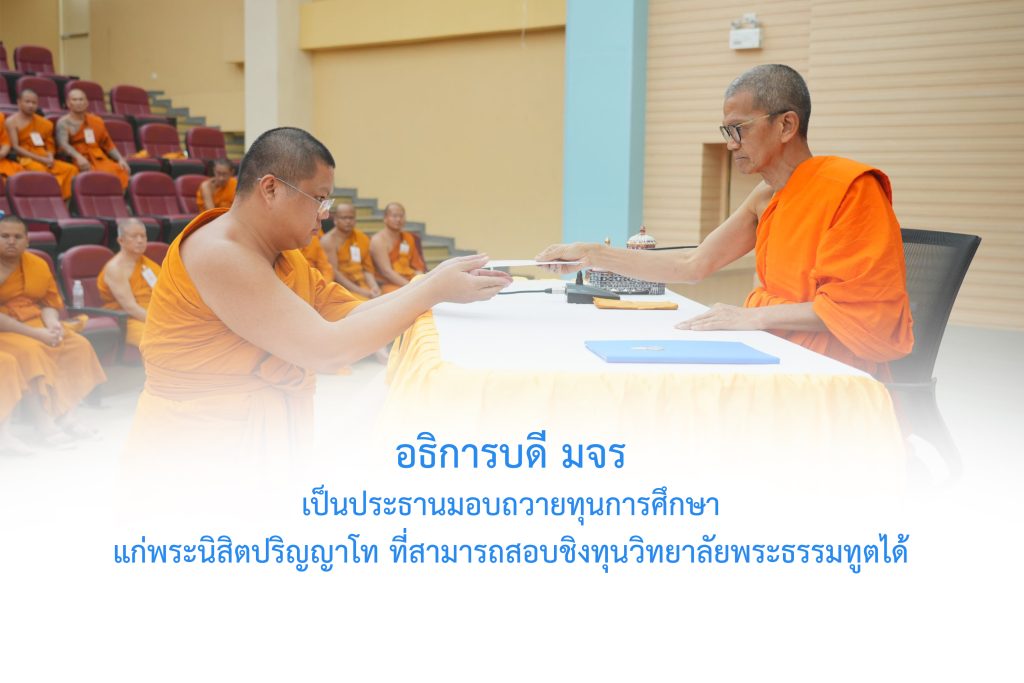 วันจันทร์ที่ ๑๖ มีนาคม พ.ศ.๒๕๖๙ เวลา ๑๓.๓๐ น. พระพรหมวัชรธีราจารย์ อธิการบดีมหาวิทยาลัยมหาจุฬาลงกรณราชวิทยาลัย เป็นประธานมอบถวายทุนการศึกษา แก่พระนิสิตปริญญาโท ๙ รูป ที่สามารถสอบชิงทุนวิทยาลัยพระธรรมทูตได้ ณ ห้องประชุมเธียเตอร์โซนบี อาคารเรียนรวม มจร พระนครศรีอยุธยา พระสิทธิวัชรบัณฑิต รองอธิการบดีฝ่ายกิจการต่างประเทศ พร้อมด้วย ประธานกรรมการจัดหาทุนการศึกษา ส่งพระธรรมทูตเรียนปริญญาโท มจร (Full Scholarship) จำนวน ๙ ทุน ๆ ละ ๑๐๐,๐๐๐ บาท (หนึ่งแสนบาทถ้วน) รวมเป็นเงิน จำนวน ๙๐๐,๐๐๐ บาท (เก้าแสนบาทถ้วน) พร้อมด้วย พระครูสุตรัตนบัณฑิต ผู้อำนวยการวิทยาลัยพระธรรมทูต เลขานุการคณะกรรมการจัดหาทุน ฯ และ พระมหากฤษณ กิตฺติภทฺโท ผู้อำนวยการสำนักงานวิทยาลัยพระธรรมทูต ได้จัดโครงการมอบทุนการศึกษา Full Scholarship แก่นิสิตปริญญาโทที่สามารถสอบชิงทุนวิทยาลัยพระธรรมทูตได้ ตามนโยบายขององค์อธิการบดี วิทยาลัยพระธรรมทูต …