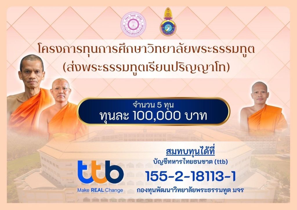 วิทยาลัยพระธรรมทูต มจร จัดโครงการทุนการศึกษาวิทยาลัยพระธรรมทูต ส่งพระธรรมทูตเรียนปริญญาโท มจร (Full Scholarship) จำนวน ๕ ทุน ๆ ละ ๑๐๐,๐๐๐ บาท (หนึ่งแสนบาทถ้วน) รวมเป็นเงิน จำนวน ๕๐๐,๐๐๐ บาท (ห้าแสนบาทถ้วน) คุณสมบัติผู้ได้รับทุนการศึกษาระดับปริญญาโท ดังนี้คือ (๑) เป็นพระภิกษุ – สามเณร (๒) สำเร็จการศึกษาปริญญาตรี ไม่จำกัดสาขา เกรดเฉลี่ยสะสมไม่ต่ำกว่า ๒.๐๐ หรือ สำเร็จการศึกษาเปรียญธรรม ๙ ประโยค (๓) มีมนุษยสัมพันธ์และจิตอาสาทำงานอุทิศตนเผยแผ่พระพุทธศาสนา ด้วยความเสียสละ (๔) มีเกียรติประวัติดีงาม และมีสมณวัตรปฏิปทา ศีลาจริยวัตร เป็นที่ศรัทธาเลื่อมใส และ(๕) มีทักษะการสื่อสารภาษาอังกฤษที่สามารถใช้งานได้ดี สำหรับพระภิกษุสามเณรที่ประสงค์เข้าศึกษาในหลักสูตรปริญญาโท มหาวิทยาลัยมหาจุฬาลงกรณราชวิทยาลัย ทุกสาขาวิชา สามารถสมัครสอบชิงทุนการศึกษาวิทยาลัยพระธรรมทูต ได้ พระภิกษุสามเณรที่ได้รับทุนการศึกษาจากวิทยาลัยพระธรรมทูต มีข้อกำหนดให้ฝึกงานเป็นพระธรรมทูตสายต่างประเทศ จิตอาสา ณ วิทยาลัยพระธรรมทูต …