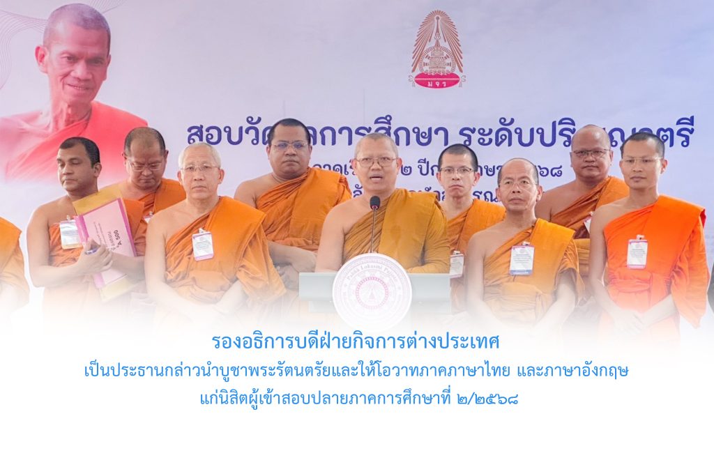 วันพุธที่ ๒๕ กุมภาพันธ์ พ.ศ.๒๕๖๙ เวลา ๑๒.๔๕ น. พระสิทธิวัชรบัณฑิต รองอธิการบดีฝ่ายกิจการต่างประเทศ เป็นประธานกล่าวนำบูชาพระรัตนตรัย กล่าวขอบคุณสำนักทะเบียนและวัดผล และคณะกรรมการดำเนินงานจัดสอบปลาย และให้โอวาทภาคภาษาไทย และภาษาอังกฤษ แก่นิสิตผู้เข้าสอบปลายภาคการศึกษาที่ ๒/๒๕๖๘ ณ สำนักทะเบียนและวัดผล มจร พระนครศรีอยุธยา ฯ