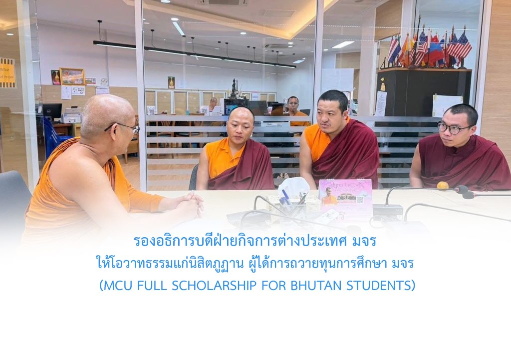 วันอังคารที่ ๒๐ มกราคม พ.ศ.๒๕๖๙ เวลา ๐๙.๑๕ น. พระสิทธิวัชรบัณฑิต รองอธิการบดีฝ่ายกิจการต่างประเทศ ประธานคณะกรรมการอุปถัมภ์ทุนการศึกษาแก่นิสิตพระสงฆ์ภูฏาน มจร ๓ รูป ได้ให้โอวาทธรรม กำลังใจและให้คำปรึกษาการเรียนแก่นิสิตภูฏาน มจร ๓ รูป ได้แก่ (1) Venerable Thinley Wangdi (Ph.D. scholar) 2) Venerable Pema Thinley(M.A.Student) (3) Venerable Tshering Wangchuk (B.A.Student) พระสงฆ์ภูฏานทั้ง ๓ รูป นี้ ได้รับทุนการศึกษาจาก มจร ตลอดหลักสูตร (MCU Full Scholarship for Bhutan Students) ณ ห้องประชุมวิทยาลัยพระธรรมทูตและกองวิเทศสัมพันธ์ มจร พระนครศรีอยุธยา มหาวิทยาลัยมหาจุฬาลงกรณราชวิทยาลัย ร่วมกับ สถานเอกอัครราชทูตภูฏานประจำประเทศไทย คณะสงฆ์ภูฏานแห่งราชอาณาจักรภูฏาน …