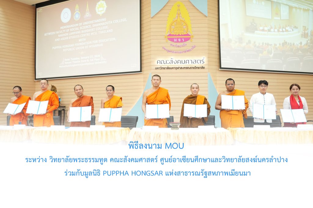 วันอังคารที่ ๒๗ มกราคม พ.ศ.๒๕๖๙ เวลา ๑๓.๐๐ น. พระสิทธิวัชรบัณฑิต รองอธิการบดีฝ่ายกิจการต่างประเทศ เป็นประธานในพิธี ลงนาม MOU ระหว่าง วิทยาลัยพระธรรมทูต คณะสังคมศาสตร์ ศูนย์อาเซียนศึกษาและวิทยาลัยสงฆ์นครลำปาง ร่วมกับมูลนิธิ Puppha Hongsar แห่งสาธารณรัฐสหภาพเมียนมา ณ ห้องประชุมคณะสังคมศาสตร์ อาคารเรียนรวม มจร พระนครศรีอยุธยา โอกาสนี้ ๑) พระอุดมสิทธินายก, รศ.ดร.คณบดีคณะสังคมศาสตร์ และ พระครูสังฆวิริยกิจ รองคณบดีคณะสังคมศาสตร์ ๒) พระครูสุตรัตนบัณฑิต, ดร. ผู้อำนวยการวิทยาลัยพระธรรมทูต และ พระมหาไพฑูรย์ ปนฺตนนฺโท รองผู้อำนวยการวิทยาลัยพระธรรมทูต ฝ่ายวิชาการ ๓) พระมหานพดล สุวณณเมธี ผู้อำนวยการวิทยาลัยสงฆ์นครลำปาง ๔) พระมหาจีรวัฒน์ กนฺตวณฺโณ, รศ.ดร. และ พระครูสุภัทรธรรมบัณฑิต ผู้อำนวยการส่วนบริหาร ศูนย์อาเซียนศึกษา ) Venerable …