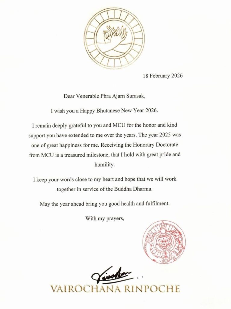วันพุธที่ ๑๘ กุมภาพันธ์ พ.ศ.๒๕๖๙ เวลา ๐๖.๐๙ น. His Eminence Vairochana Rinpoche, The Kingdom of Bhutan ส่งสารอวยพร พระสิทธิวัชรบัณฑิต รองอธิการบดีฝ่ายกิจการต่างประเทศ มจร เนื่องในมงคลดิถีอภิลักขิตสมัย ปีใหม่ ของราชอาณาจักรภูฏาน ฯ