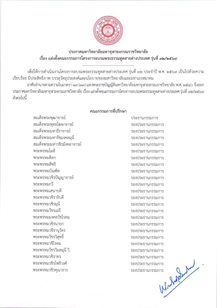 ประกาศมหาวิทยาลัยมหาจุฬาลงกรณราชวิทยาลัย เรื่อง แต่งตั้งคณะกรรมการโครงการอบรมพระธรรมทูตสายต่างประเทศ รุ่นที่ ๓๒/๒๕๖๙