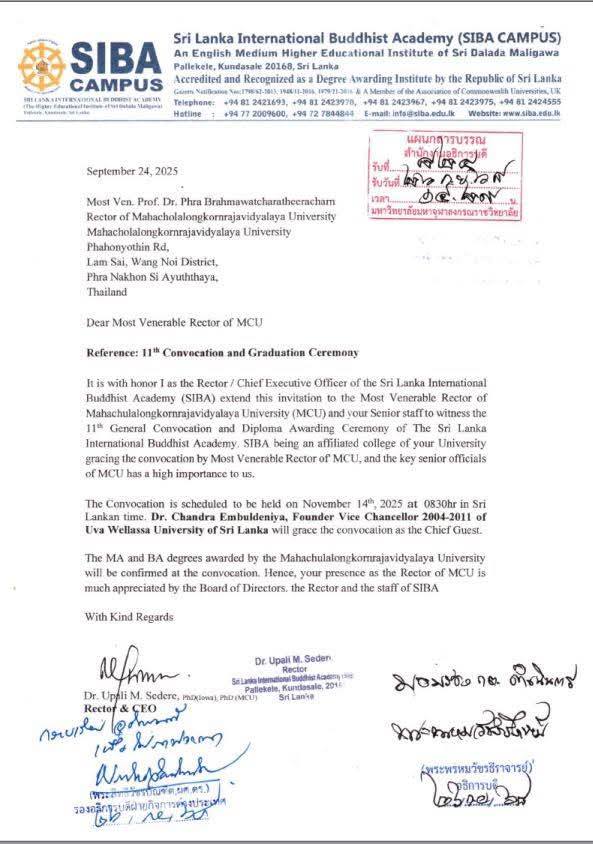 วันเสาร์ที่ ๒๗ กันยายน พ.ศ.๒๕๖๘ เวลา ๐๙.๔๕ น. พระสิทธิวัชรบัณฑิต รองอธิการบดีฝ่ายกิจการต่างประเทศ ในนาม พระพพรหมวัชรธีราจารย์ อธิการบดี ได้อาราธนา พระวัชรพุทธิบัณฑิต รองอธิการบดี มจร วิทยาเขตนครศรีธรรมราช เป็นผู้แทน มจร เดินทางไปปฏิบัติศาสนกิจเข้าร่วมพิธีประสาทปริญญาสมัยสามัญประจำปี และ ปาฐกถา ณ วิทยาลัยพระพุทธศาสนานานาชาติศรีลังกา นครแคนดี ประเทศศรีลังกา (Sri Lanka lnternational Buddhist Academy, Kandy Sri Lanka ) สถาบันสมทบ มจร ระหว่างวันที่ ๑๓-๑๕ พฤศจิกายน ๒๕๖๘