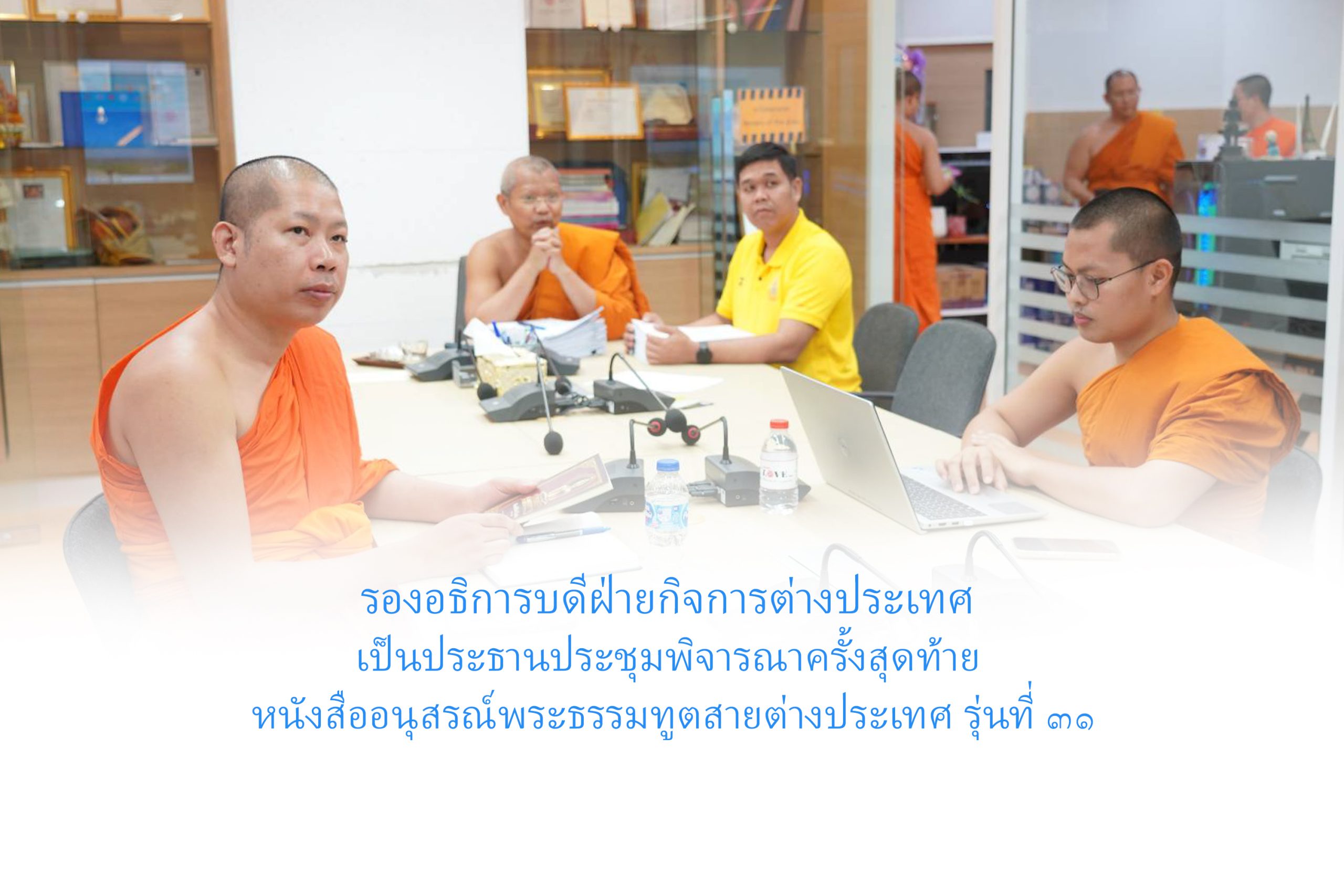 วันจันทร์ที่ ๒๐ ตุลาคม พ.ศ.๒๕๖๘ เวลา ๑๐.๓๐ น. พระสิทธิวัชรบัณฑิต รองอธิการบดีฝ่ายกิจการต่างประเทศ ประธานคณะกรรมการดำเนินงานโครงการอบรมพระธรรมทูตสายต่างประเทศ ประธานคณะกรรมการดำเนินงานโครงการอบรมพระธรรมทูตนานาชาติ ประธานคณะกรรมการดำเนินงานโครงการอบรมธรรมทูตคฤหัสถ์ในประเทศและต่างประเทศ เป็นประธานประชุมพิจารณาหนังสืออนุสรณ์พระธรรมทูตสายต่างประเทศ รุ่นที่ ๓๑ ครั้งสุดท้าย ก่อนส่งโรงพิมพ์ภายในเดือนตุลาคม ศกนี้ ณ ห้องประชุมวิทยาลัยพระธรรมทูตและกองวิเทศสัมพันธ์ มจร พระนครศรีอยุธยา