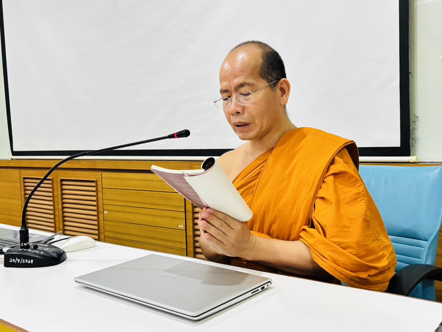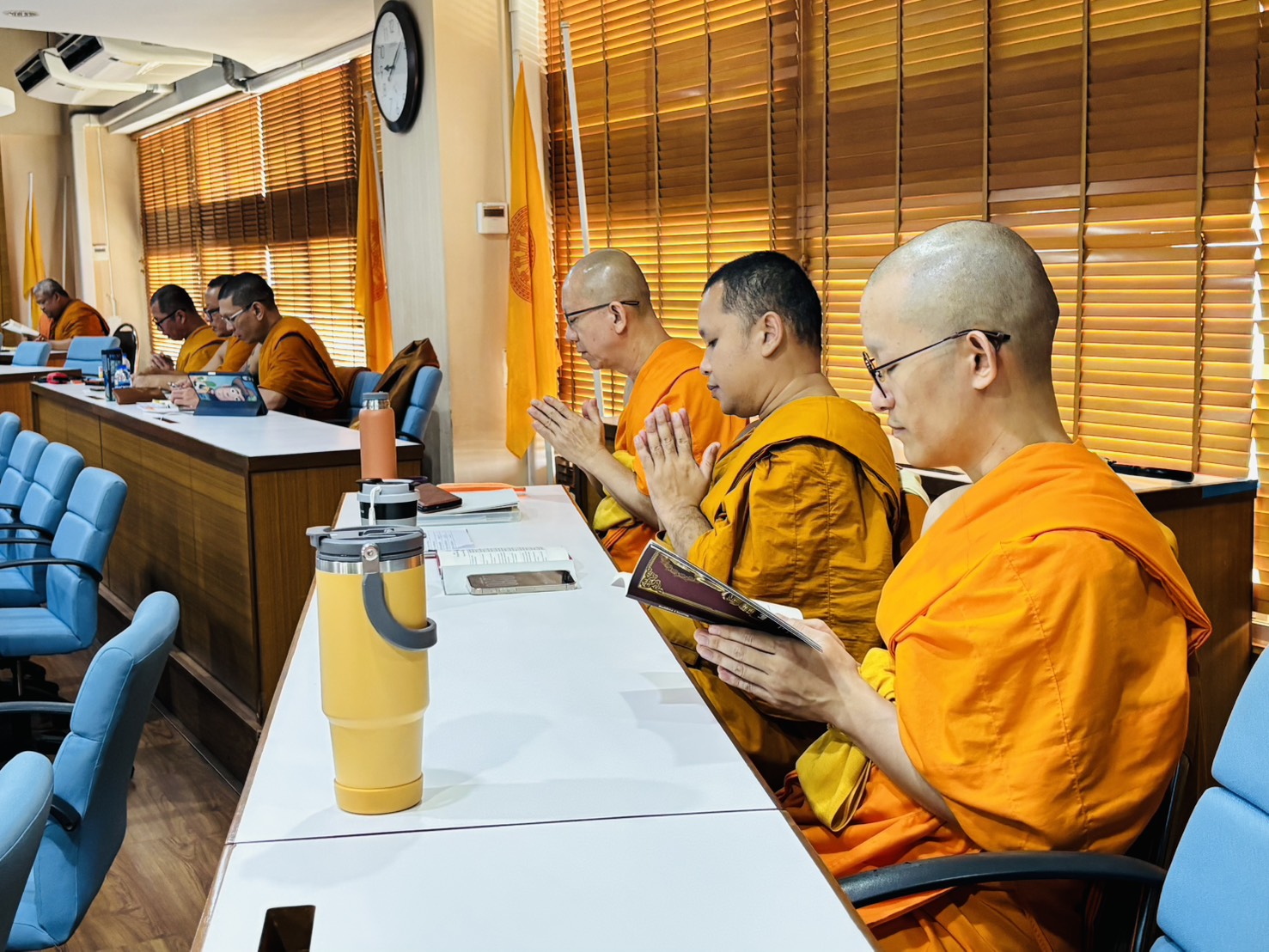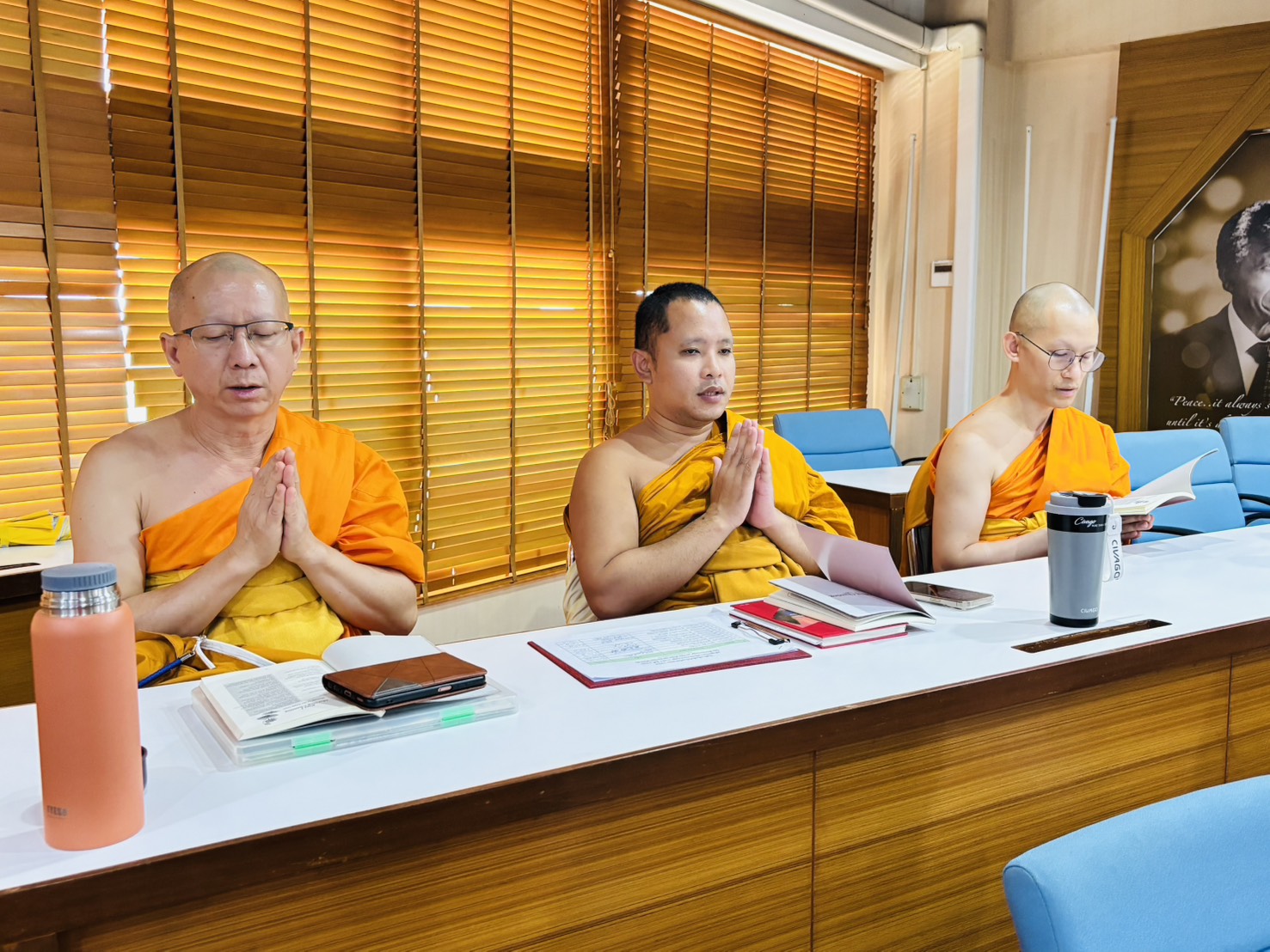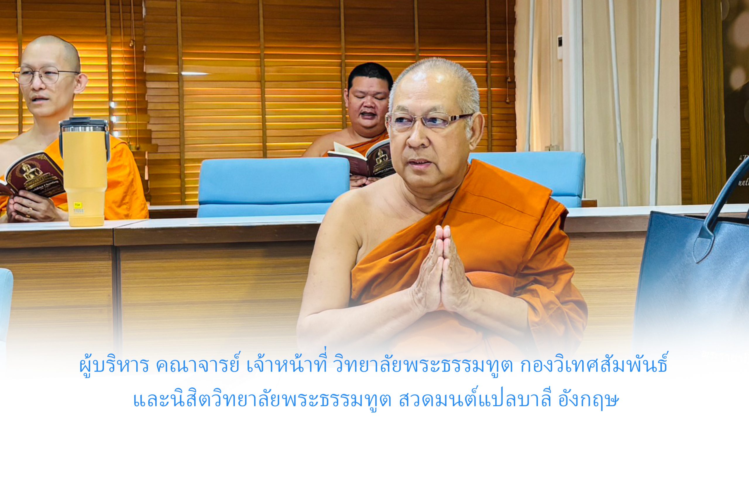 วันจันทร์ที่ ๓ พฤศจิกายน พ.ศ.๒๕๖๘ เวลา ๐๙.๐๐ น. พระครูใบฎีกาแสงเฮือง นรินฺโท, ดร. รองผู้อำนวยการวิทยาลัยพระธรรมทูต ฝ่ายบริหาร ผู้อำนวยการหลักสูตรประกาศนียบัตรวิปัสสนากรรมฐาน (หลักสูตรนานาชาติ) นำผู้บริหาร คณาจารย์ เจ้าหน้าที่ วิทยาลัยพระธรรมทูต กองวิเทศสัมพันธ์ และลูกศิษย์หลักสูตรประกาศนียบัตรพระธรรมทูต นิสิตหลักสูตรประกาศนียบัตรวิปัสสนากรรมฐาน (หลักสูตรนานาชาติ) สวดมนต์แปลบาลี อังกฤษ ณ ห้องเรียนสันติศึกษา อาคารสมเด็จพระพุฒาจารย์ (เกี่ยว อุปเสณมหาเถร) อาคารเรียนรวม มจร จังหวัดพระนครศรีอยุธยา ฯ