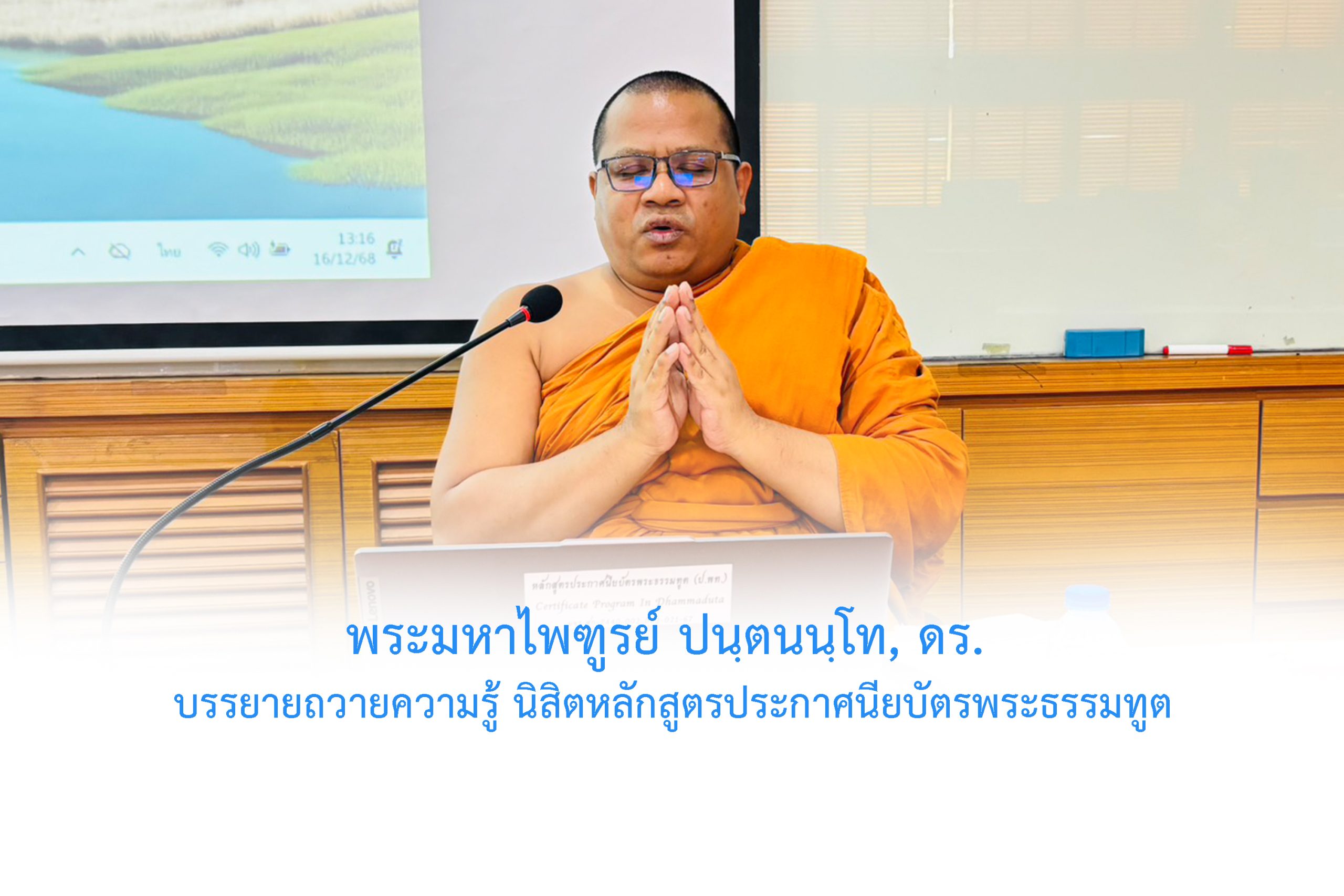 วันอังคารที่ ๑๖ ธันวาคม พ.ศ. ๒๕๖๘ เวลา ๑๓.๐๐ พระมหาไพฑูรย์ ปนฺตนนฺโท, ดร. รองผู้อำนวยการวิทยาลัยพระธรรมทูต ฝ่ายวิชาการ ผู้อำนวยการหลักสูตรประกาศนียบัตรพระธรรมทูต บรรยายถวายความรู้ วิชาหลักพุทธธรรมภาคภาษาอังกฤษ แก่นิสิตหลักสูตรประกาศนียบัตรพระธรรมทูต รุ่นที่ ๓ ณ ห้องเรียนสันติศึกษา อาคารสมเด็จพระพุฒาจารย์ (เกี่ยว อุปเสณมหาเถร) อาคารเรียนรวม มจร จังหวัดพระนครศรีอยุธยา ฯ