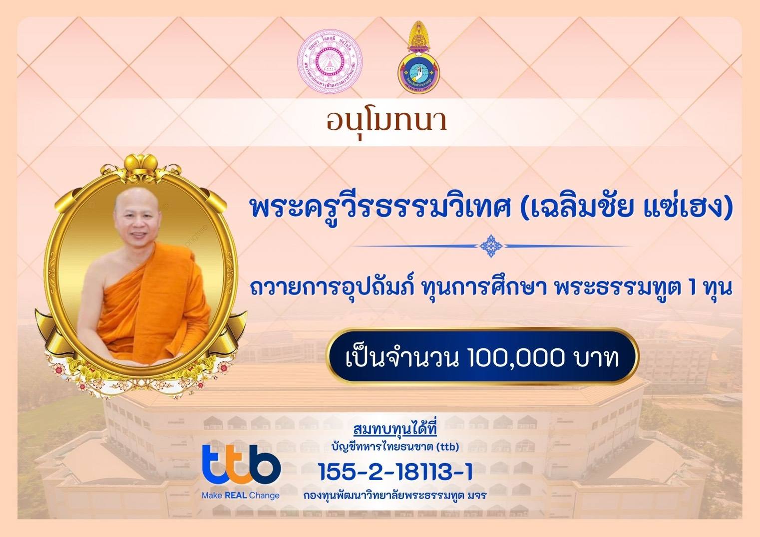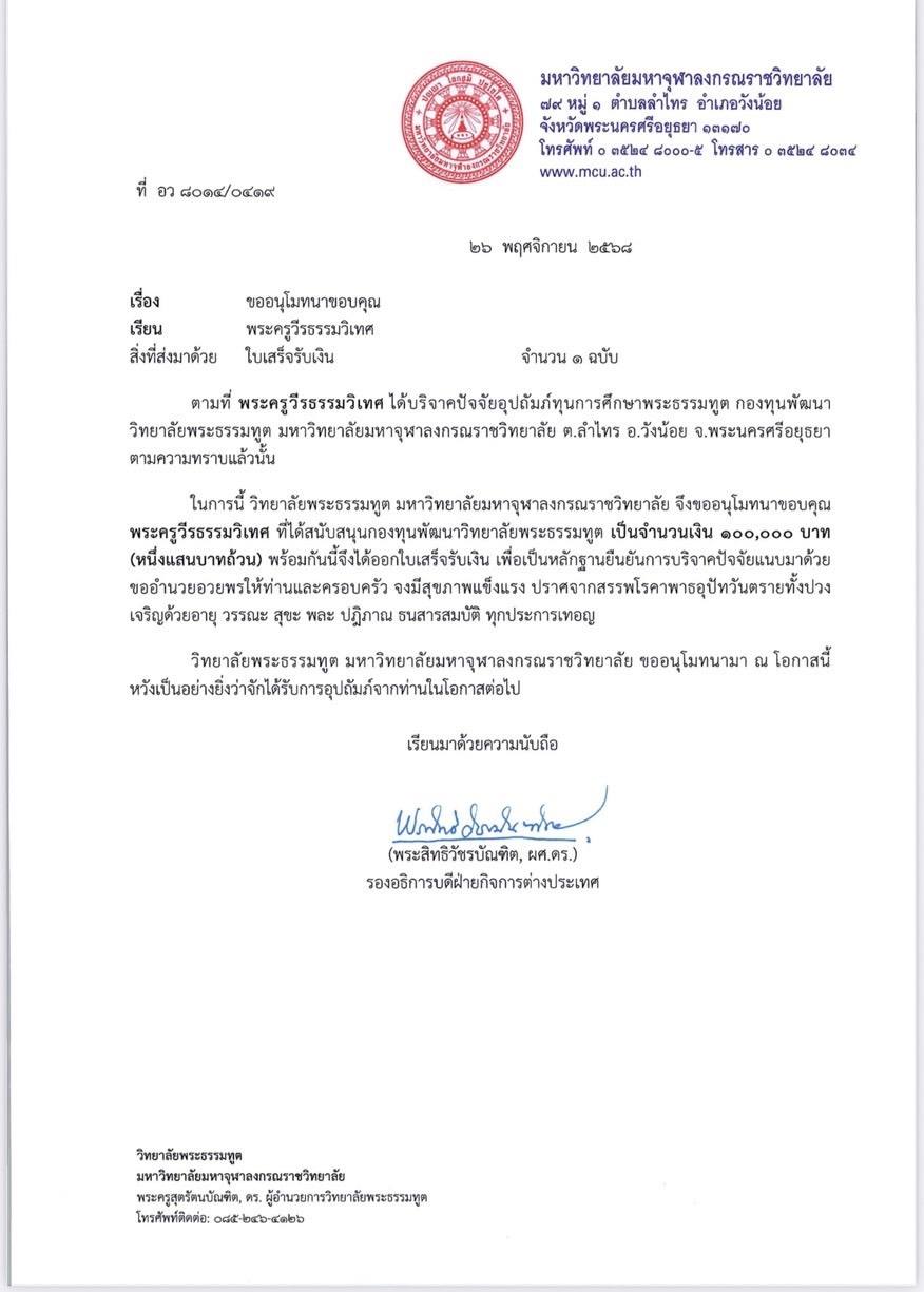 ขอขอบพระคุณ พระครูวีรธรรมวิเทศ,ดร. ที่เมตตาถวายทุนการศึกษาแก่พระธรรมทูตเรียนปริญญาโท มจร มา ณ โอกาสนี้ ฯ