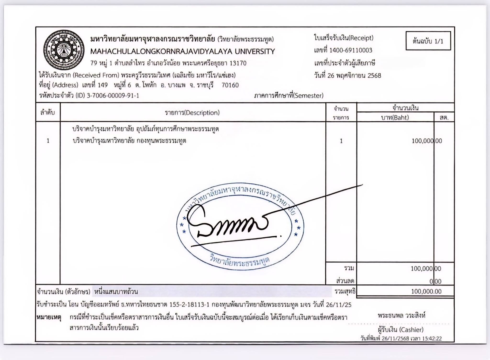 พระครูวีรธรรมวิเทศ,ดร. เจ้าอาวาสวัดธรรมสาทิส สิงคโปร์ กัลยาณมิตร พระสิทธิวัชรบัณฑิต รองอธิการบดีฝ่ายกิจการต่างประเทศ เมตตาเป็นเจ้าภาพถวายทุนการศึกษา ๑ ทุน จำนวน ๑๐๐,๐๐๐ บาท(หนึ่งแสนบาทถ้วน) แก่ พระธรรมทูต มจร ใน “โครงการทุนการศึกษาวิทยาลัยพระธรรมทูต ส่งพระธรรมทูตเรียนปริญญาโท มจร”
