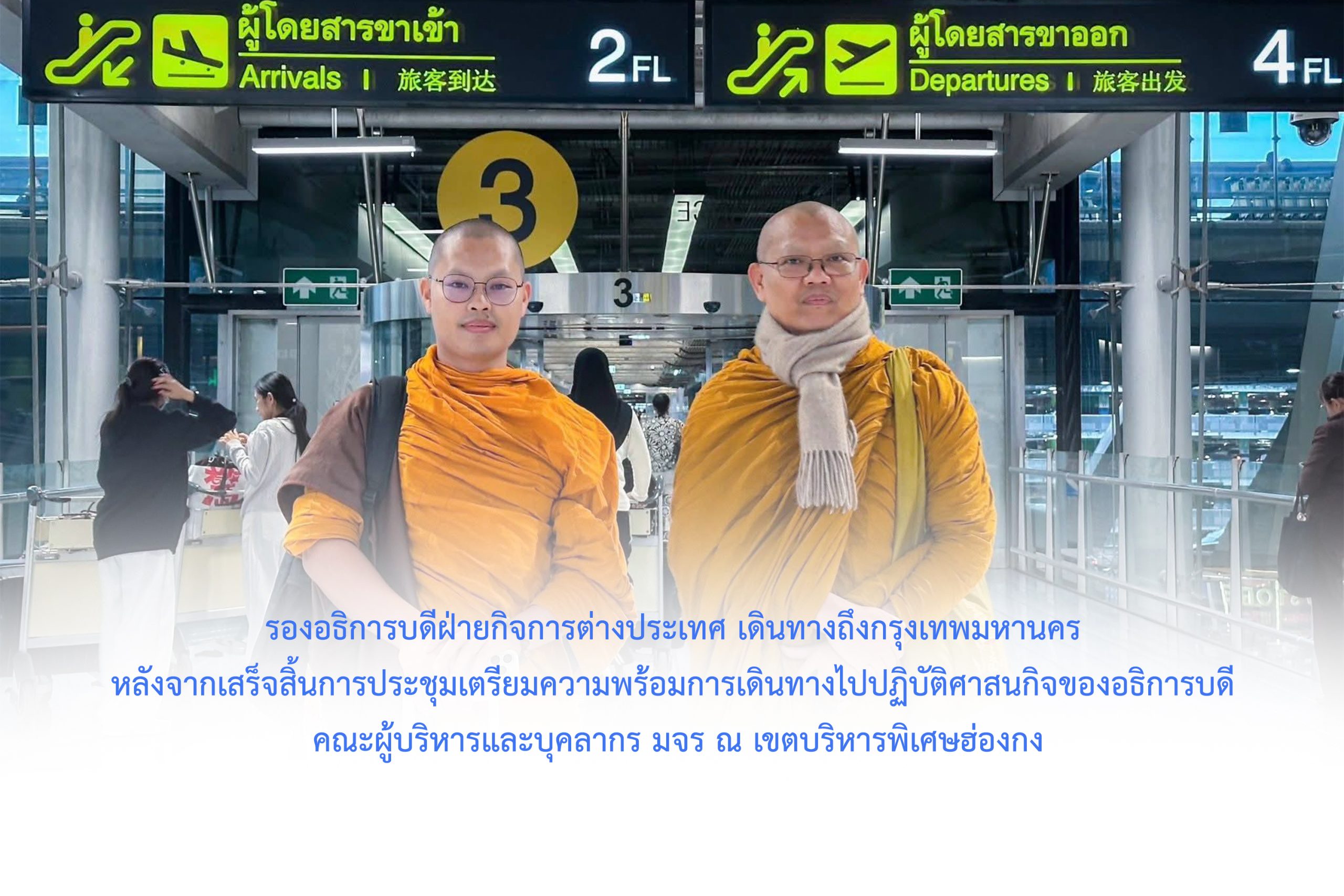 วันเสาร์ที่ ๓ มกราคม พ.ศ.๒๕๖๙ เวลา ๑๗.๓๐ น. พระสิทธิวัชรบัณฑิต รองอธิการบดีฝ่ายกิจการต่างประเทศ ประธานคณะกรรมการดำเนินงานการเดินทางไปปฏิบัติศาสนกิจของอธิการบดี คณะผู้บริหารและบุคลากร มจร ณ สถาบันสมทบ มจร เขตบริหารพิเศษฮ่องกง พร้อมด้วย พระมหากฤษณ กิตฺติภทฺโท,ดร. ผู้อำนวยการสำนักงานวิทยาลัยพระธรรมทูต เตรียมเดินทางถึงกรุงเทพมหานคร หลังจากเสร็จสิ้นการประชุมเตรียมความพร้อมการเดินทางไปปฏิบัติศาสนกิจของอธิการบดี คณะผู้บริหารและบุคลากร มจร ณ เขตบริหารพิเศษฮ่องกง ระหว่างวันที่ ๕-๗ มกราคม ๒๕๖๙