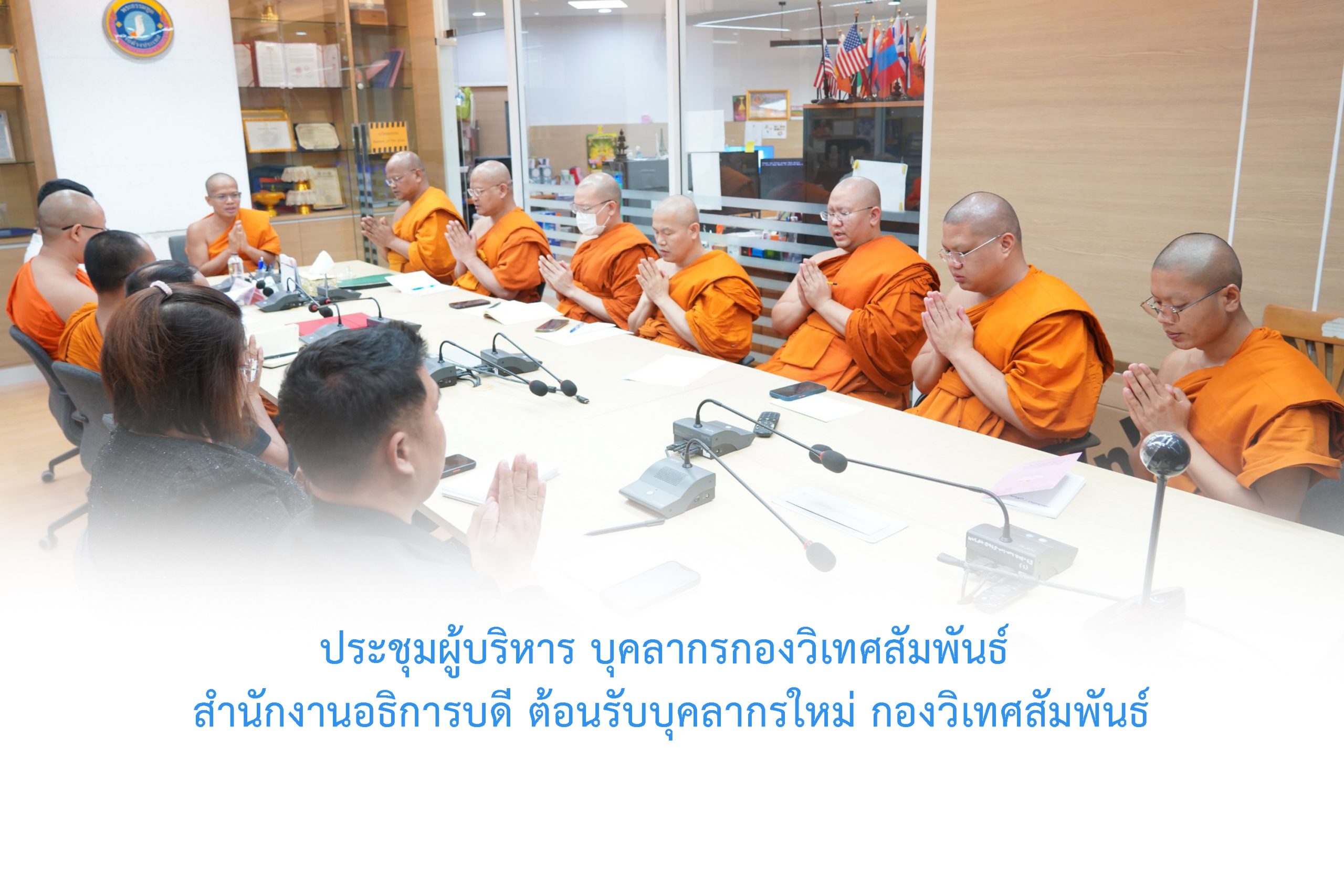 วันอังคารที่ ๓ กุมภาพันธ์ พ.ศ. ๒๕๖๙ เวลา ๑๖.๐๐ น. พระครูสุตรัตนบัณฑิต, ดร. รักษาการผู้อำนวยการกองวิเทศสัมพันธ์ ประชุมผู้บริหาร บุคลากรกองวิเทศสัมพันธ์ แสดงความยินดีต้อนรับบุคลากรใหม่ พระมหาชุติพนธ์ ญาณเมธี ป.ธ.๘ ตำแหน่ง นักวิเทศสัมพันธ์ กองวิเทศสัมพันธ์ สำนักงานอธิการบดี และมอบหมายภาระงานบุคลากร ณ ห้องประชุมกองวิเทศสัมพันธ์ ดี ๓๐๐ อาคารสมเด็จพระพุฒาจารย์ (เกี่ยว อุปเสณมหาเถร) อาคารเรียนรวม จังหวัดพระนครศรีอยุธยา