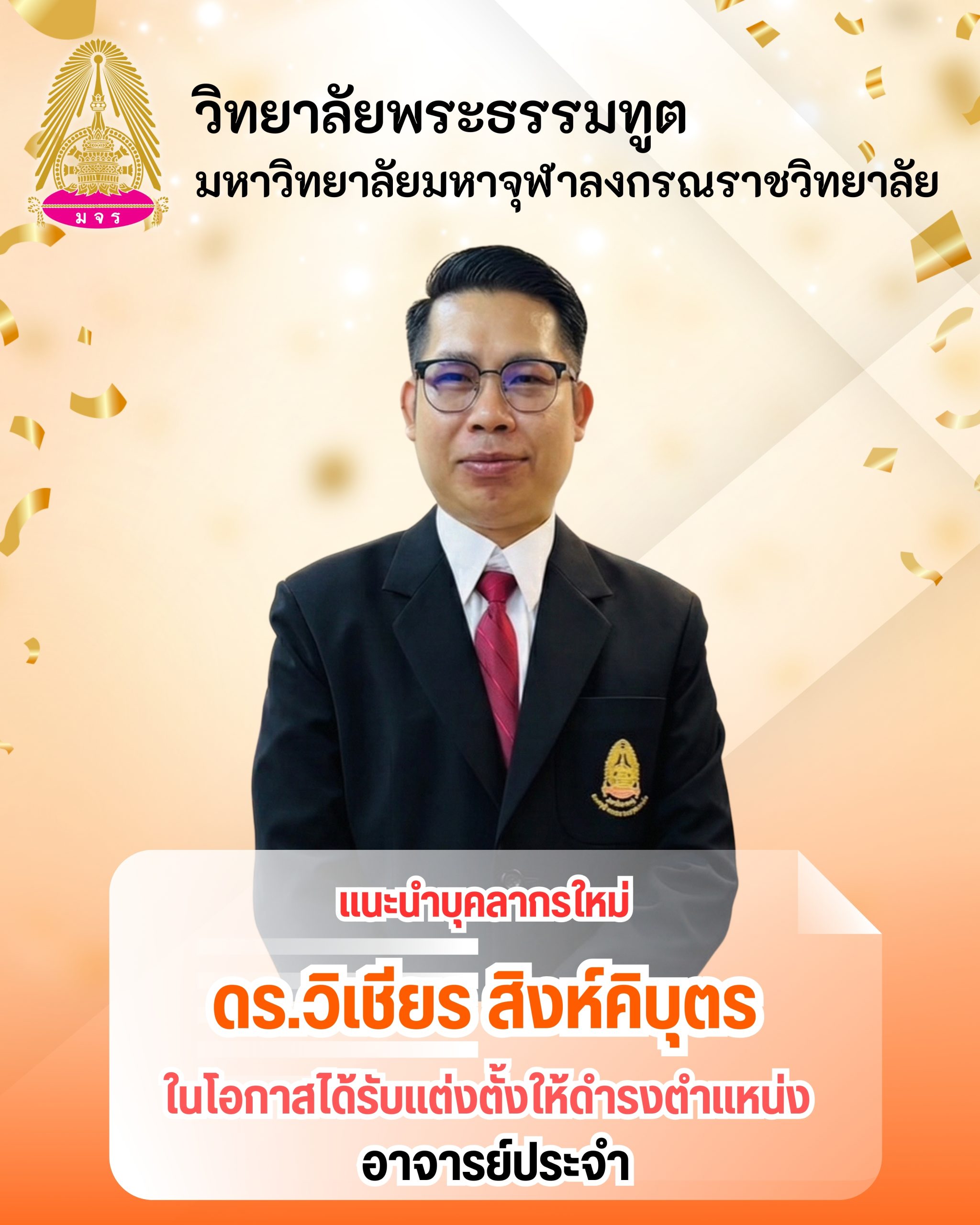 วิทยาลัยพระธรรมทูต กองวิเทศสัมพันธ์ สำนักงานอธิการบดี ยินดีต้อนรับและแนะตัวบุคลากรใหม่By Likit / 04/02/2026 ดร.วิเชียร สิงห์คิบุตร ป.ธ.๙ ตำแหน่ง อาจารย์ประจำวิทยาลัยพระธรรมทูต