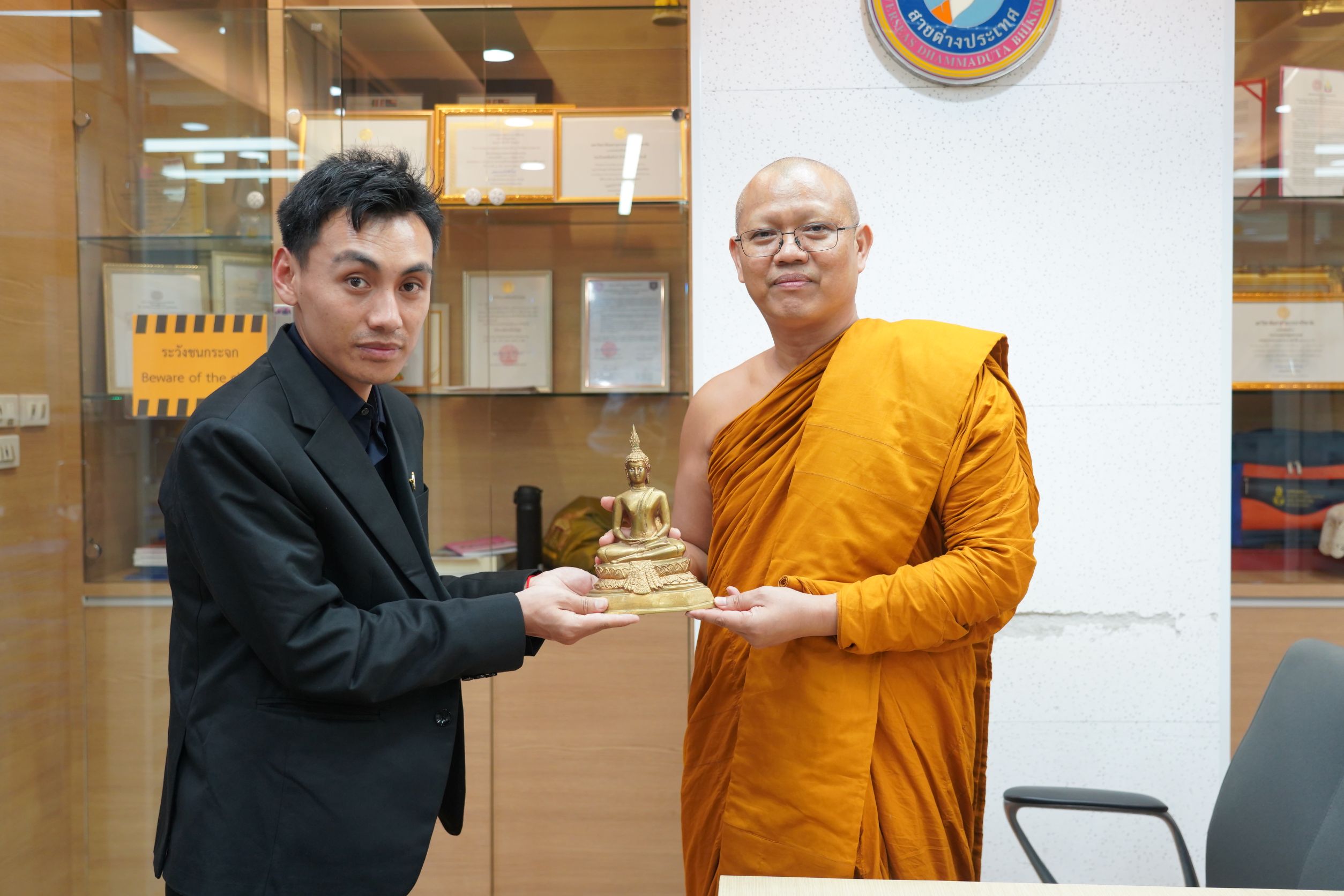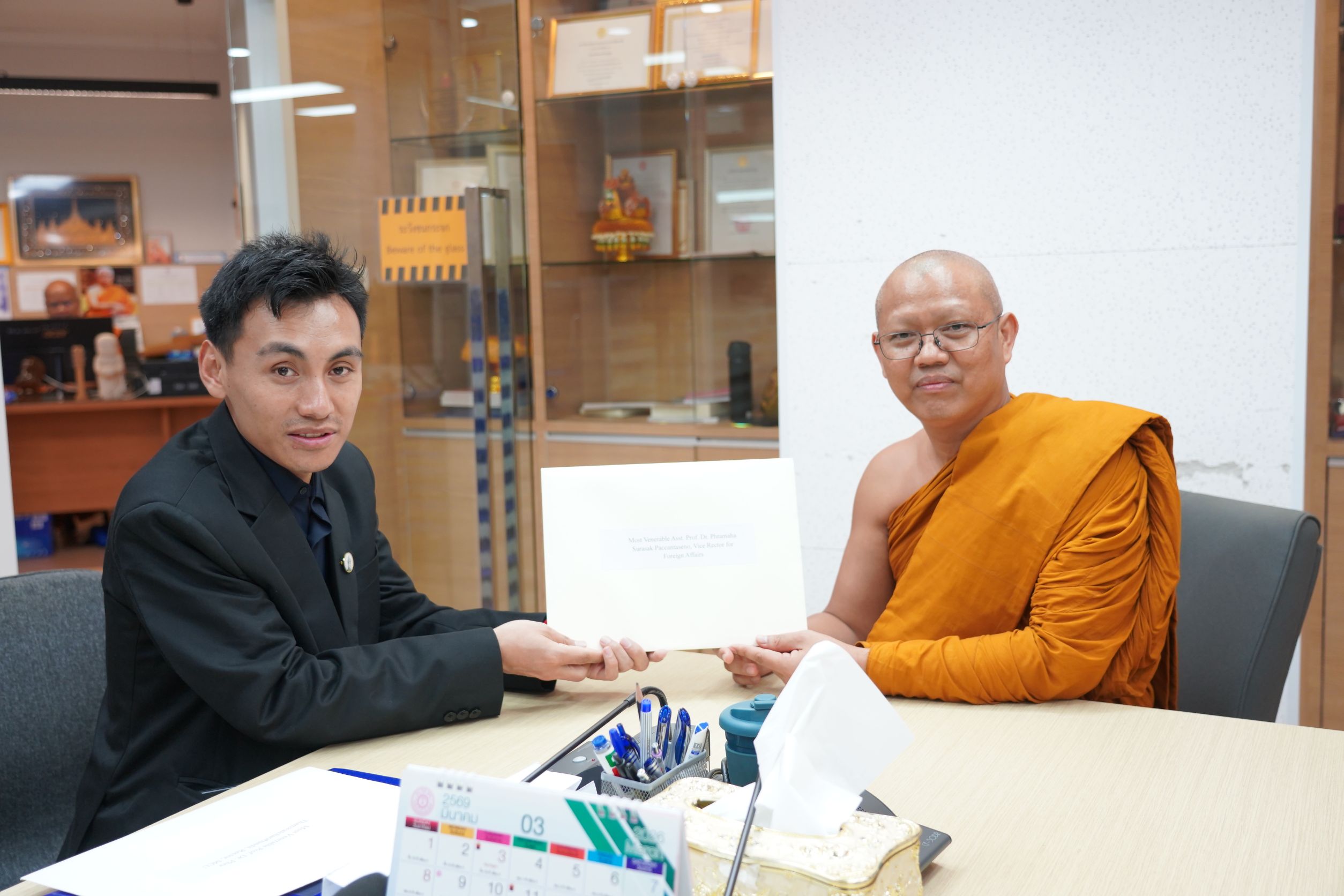 Mr. Kinley Wangyel เลขานุการเอกอัครราชทูตภูฏาน ประจำประเทศไทย อัญเชิญสารอวยพรจาก His Eminence Vairochana Rinpoche, The Kingdom of Bhutan ถวายพระสิทธิวัชรบัณฑิต รองอธิการบดีฝ่ายกิจการต่างประเทศ มจร เนื่องในมงคลดิถีอภิลักขิตสมัย ปีใหม่ ของราชอาณาจักรภูฏาน