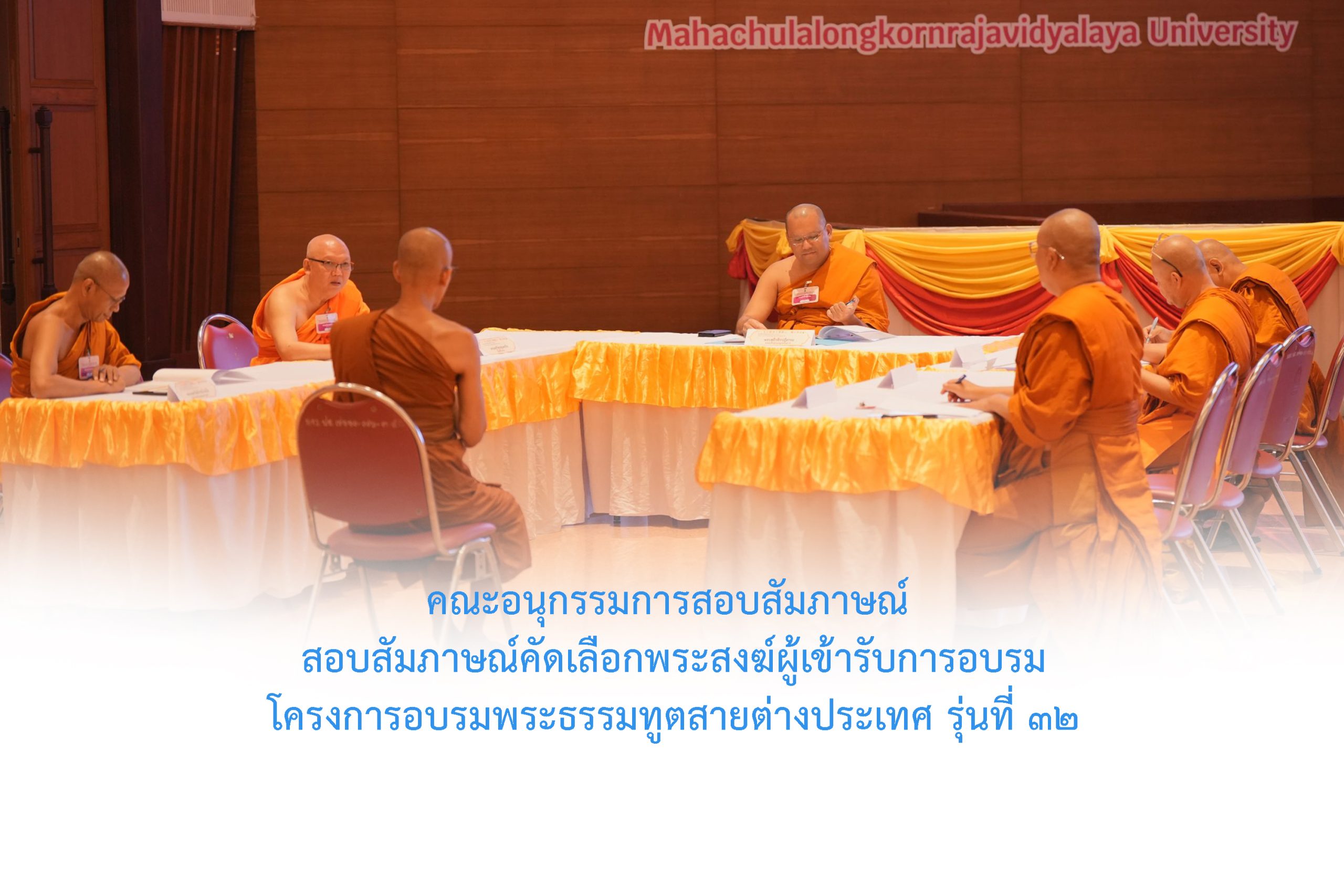 วันพฤหัสบดีที่ ๕ มีนาคม พ.ศ. ๒๕๖๙ เวลา ๐๙.๐๐ น. คณะอนุกรรมการสอบสัมภาษณ์ สอบสัมภาษณ์พระภิกษุผู้เข้ารับการอบรมพระธรรมทูตสายต่างประเทศ รุ่นที่ ๓๒ ณ หอประชุมอาคาร มวก. ๔๘ พรรษา มจร พระนครศรีอยุธยา