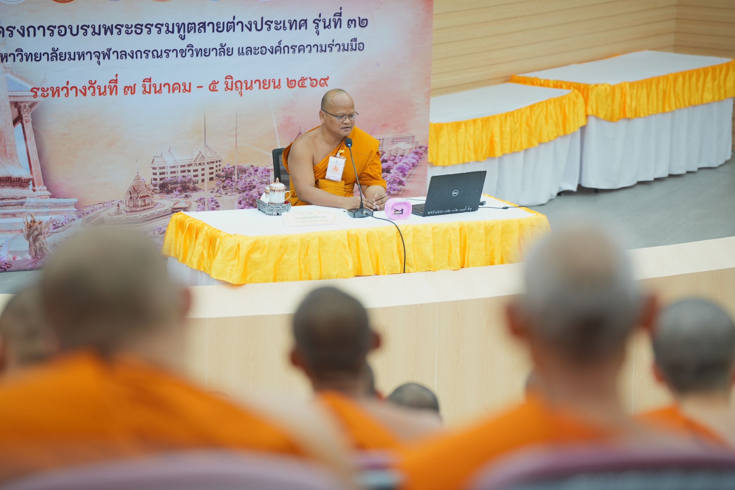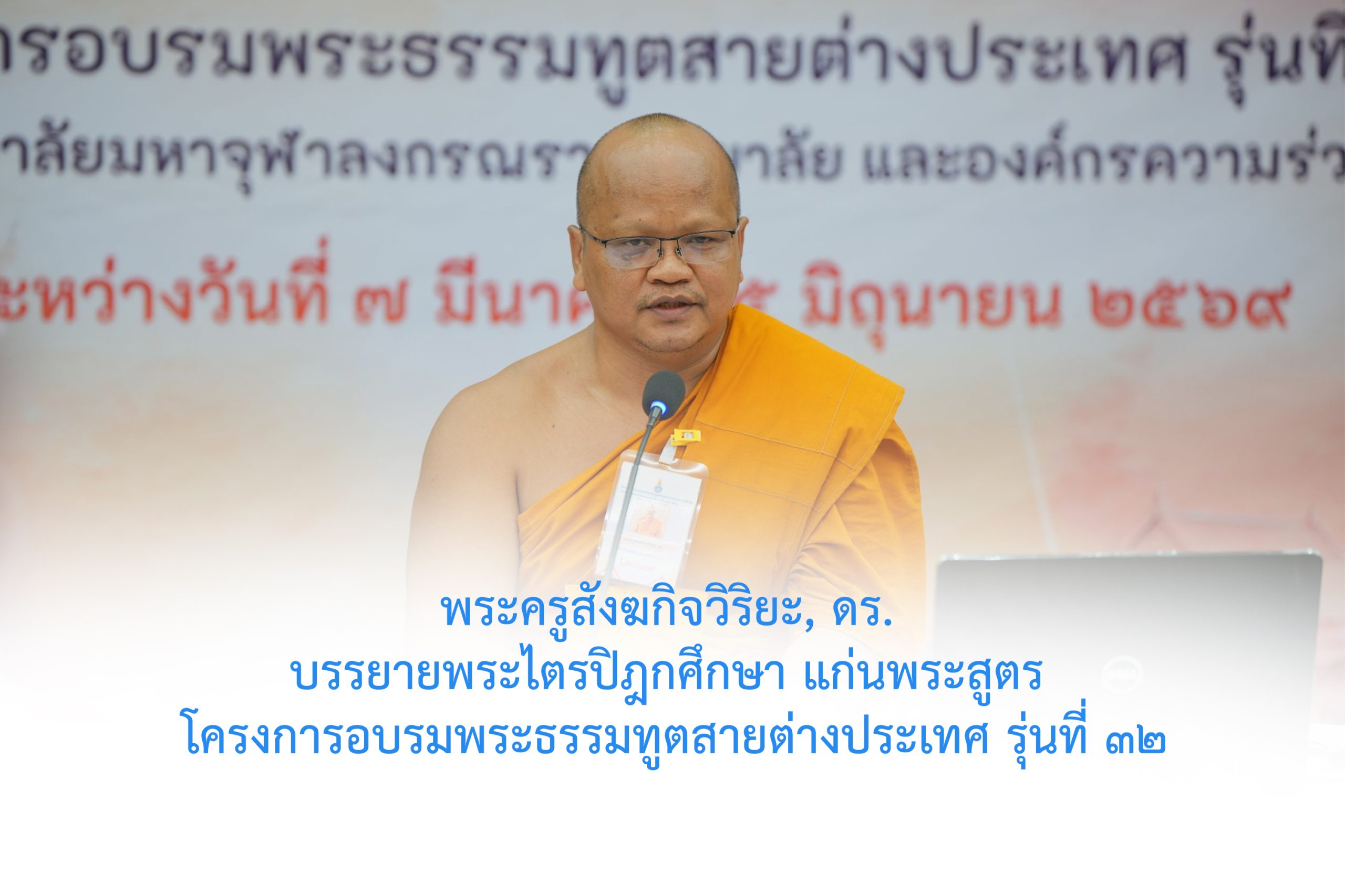 วันพุธที่ ๑๑ มีนาคม พ.ศ. ๒๕๖๙ เวลา ๑๓.๐๐ น. พระครูสังฆกิจวิริยะ, ดร. อาจารย์ประจำวิทยาลัยพระธรรมทูต บรรยายถวายความรู้แก่พระสงฆ์ผู้เข้ารับการอบรมโครงการอบรมพระธรรมทูตสายต่างประเทศ รุ่นที่ ๓๒ ในหัวข้อ พระไตรปิฎกศึกษา แก่นพระสูตร ณ ห้องเธียร์เตอร์ โซนบี อาคารสมเด็จพระพุฒาจารย์ (เกี่ยว อุปเสณมหาเถร) มหาวิทยาลัยมหาจุฬาลงกรณราชวิทยาลัย จ.พระนครศรีอยุธยา
