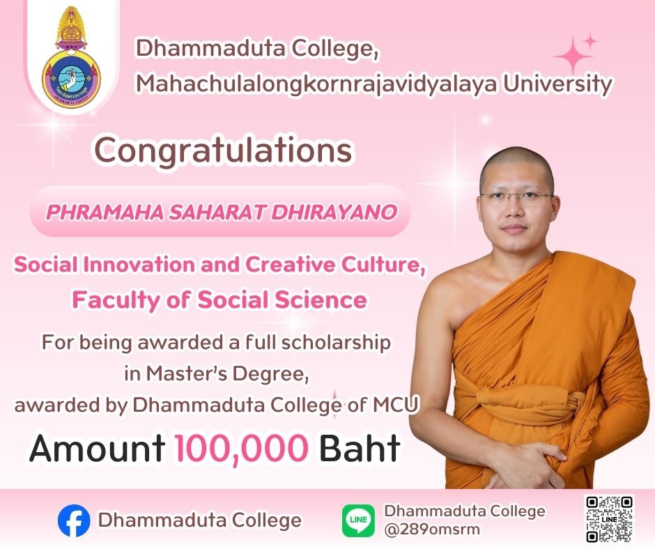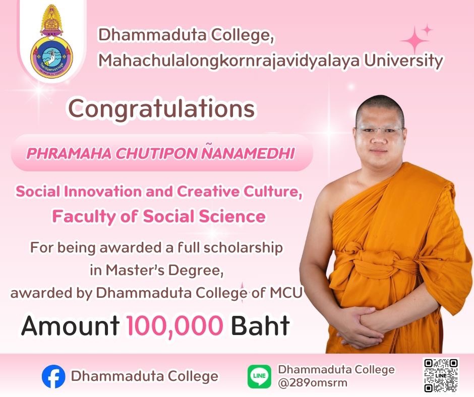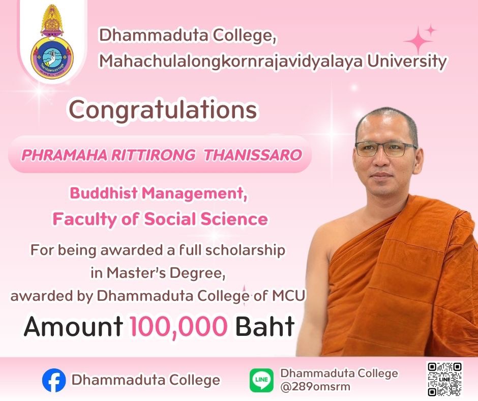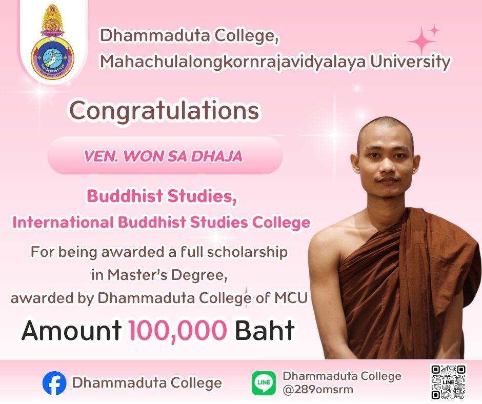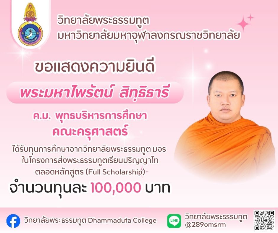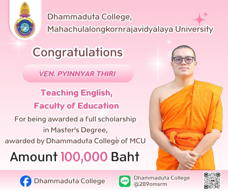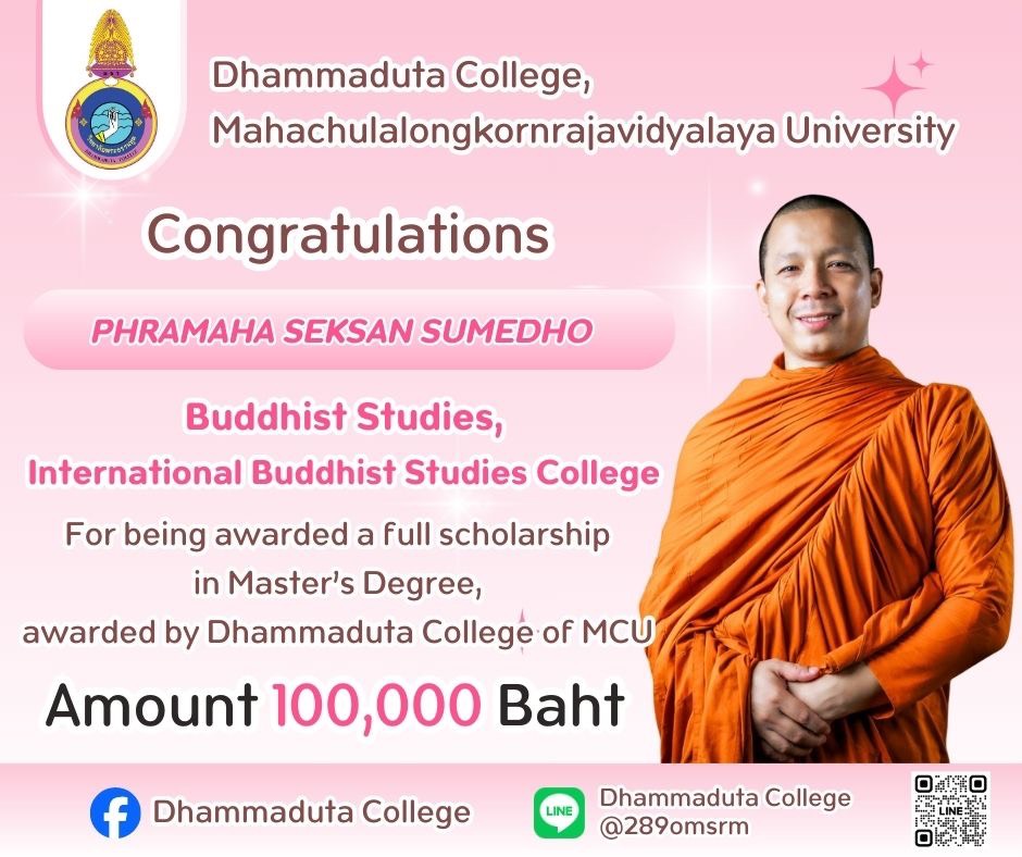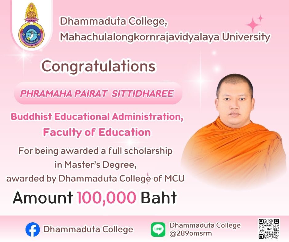พระสิทธิวัชรบัณฑิต รองอธิการบดีฝ่ายกิจการต่างประเทศ ประธานกรรมการจัดหาทุนการศึกษา ส่งพระธรรมทูตเรียนปริญญาโท มจร ตลอดหลักสูตร (Full Scholarship) จำนวน ๙ ทุน ๆ ละ ๑๐๐,๐๐๐ บาท (หนึ่งแสนบาทถ้วน) รวมเป็นเงิน จำนวน ๙๐๐,๐๐๐ บาท (เก้าแสนบาทถ้วน) พร้อมด้วย พระครูสุตรัตนบัณฑิต ผู้อำนวยการวิทยาลัยพระธรรมทูต เลขานุการคณะกรรมการจัดหาทุน ฯ และ พระมหากฤษณ กิตฺติภทฺโท ผู้อำนวยการสำนักงานวิทยาลัยพระธรรมทูต  กรรมการและผู้ช่วยเลขานุการ คณะกรรมการจัดหาทุนฯ ได้ดำเนินการมอบทุนการศึกษาตลอดหลักสูตร Full Scholarship แก่นิสิตปริญญาโทที่สามารถสอบชิงทุนวิทยาลัยพระธรรมทูตได้