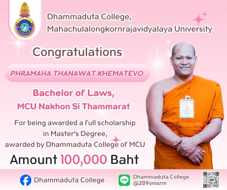 ขอขอบพระคุณ  พระธรรมาจารย์ชิงไห่ ผู้ก่อตั้งและผู้อำนวยการฝ่ายจิตวิญญาณแห่ง Medicine Buddha Meditation Group, ประเทศสหรัฐอเมริกา เจ้าภาพทุนการศึกษา ๓ ทุน ๓๐๐,๐๐๐ บาท ขอขอบคุณ พระครูวีรธรรมวิเทศ เจ้าอาวาสวัดธรรมสาทิส สิงคโปร์ เจ้าภาพทุนการศึกษา ๑ ทุน ๑๐๐,๐๐๐ บาท พระครูภาวนากิจวิเทศ วิ. เจ้าอาวาสวัดพระธรรมกาย สิงคโปร์ เจ้าภาพทุนการศึกษา ๑ ทุน ๑๐๐,๐๐๐ บาท และ ขออนุโมทนาขอบคุณ  Honorable Dhammesi Teo Siao Wei ธรรมทูตคฤหัสถ์เกียรติคุณ ชาวมาเลเซีย เป็นเจ้าภาพถวายทุนการศึกษา ๒ ทุน ๒๐๐,๐๐๐ บาท แก่ พระธรรมทูต มจร ในโครงการทุนการศึกษาวิทยาลัยพระธรรมทูต ส่งพระธรรมทูตเรียนปริญญาโท มจร มา ณ โอกาสนี้  และขออำนวยพรให้ทานบดีทุกท่าน ประสพสุขสวัสดี เจริญรุ่งเรืองด้วยจตุรพิธพรชัยมงคลตลอดจิรัฏฐิติกาลเทอญฯ