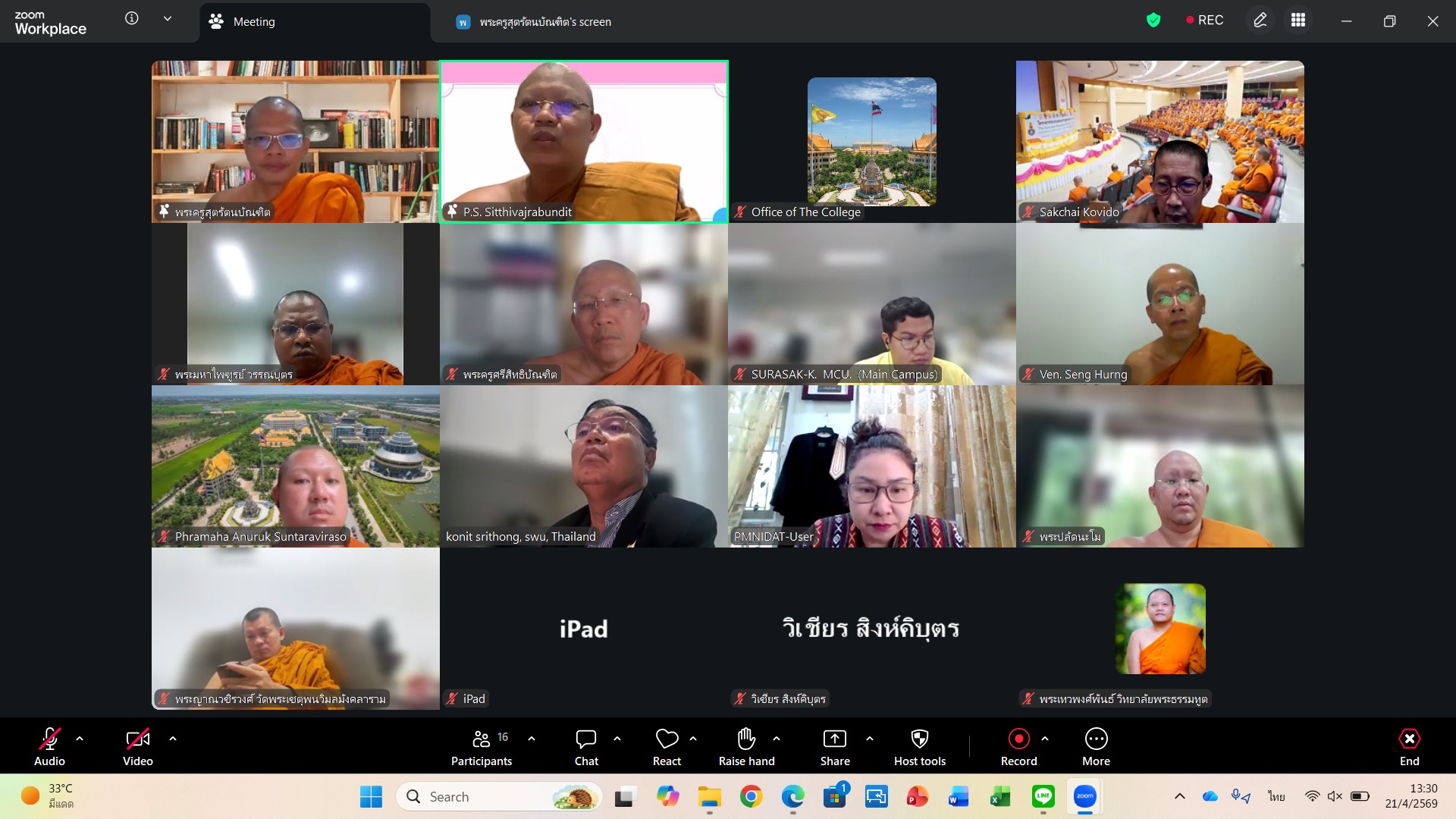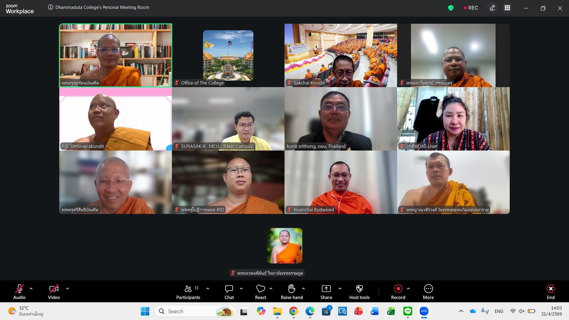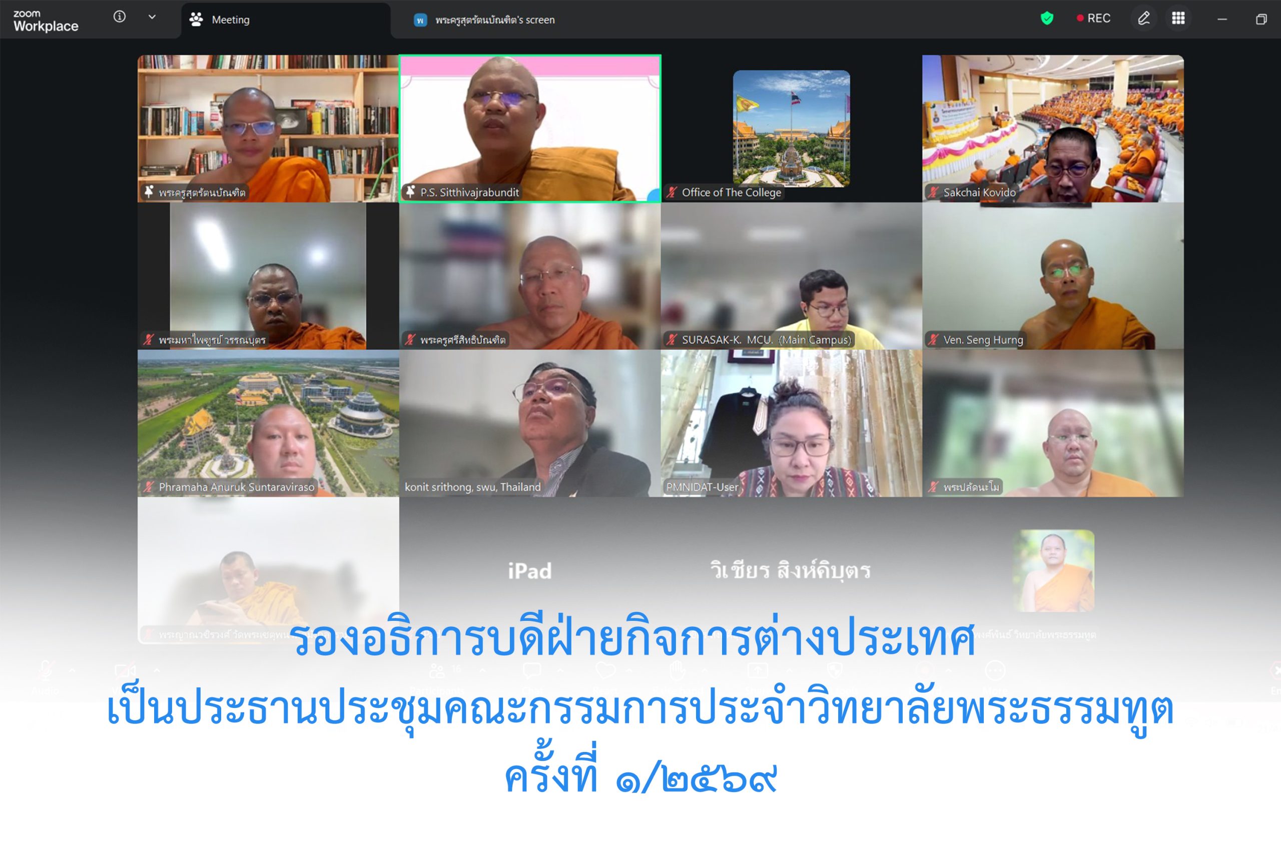 วันอังคารที่ ๒๑ เมษายน พ.ศ.๒๕๖๙ เวลา ๑๓.๐๐ น. พระสิทธิวัชรบัณฑิต รองอธิการบดีฝ่ายกิจการต่างประเทศ ประธานคณะกรรมการประจำวิทยาลัยพระธรรมทูต เป็นประธานประชุมออนไลน์คณะกรรมการวิทยาลัยพระธรรมทูตครั้งที่ ๑/๒๕๖๙ โดยมีคณะกรรมการเข้าประชุมกันอย่างพร้อมเพรียง