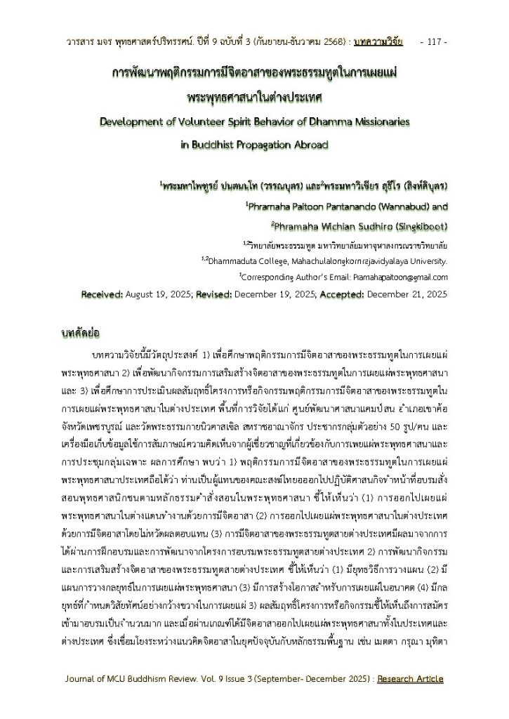 งานวิจัยการพัฒนาพฤติกรรมการมีจิตอาสาของพระธรรมทูตในการเผยแผ่พระพุทธศาสนาในต่างประเทศ thawaphongphan / January 14, 2026
